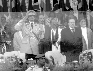 9月1日,在的黎波里,利比亚领导人卡扎菲(前左)与来宾观看利比亚革命40周年阅兵仪式。 新华社发
