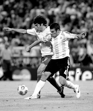 | 巴西队球员卡卡(左)与阿根廷队球员奥塔门蒂争抢。 新华社发 |