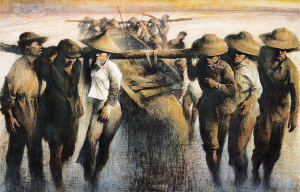 以此次作品入选全国美展的油画家王家儒、梁峰、王锐、丁孟芳、李汉波和张继光为例,他们的成就令人振奋,他们的创作水准基本代表了海南目前油画创作的崭新面貌。王家儒教授谈到,目前海南画家以地域题材创作的作品大致有两类倾向:一类是以自然景物为创作母题,作品无论是题材取向或艺术语言的应用都带有较为典型的地域特色,清逸而温煦、尽得热带情韵之妙,流淌着天然去雕饰的坦荡与洒脱,手法属具象性质的写实或写意的风姿。然而,该类作品除了极个别能进入“见山不是山,见水不是水”较深层面去掘取外,大多数作品仍处于“见山是山,见水是水”的浅层面阶段,更不用说升华到“见山还是山,见水还是水”的物我两忘、天人合一的境地。这种用笔墨造“景”而非造“境”的格局使作品囿于“小家碧玉”式的情调、缺乏纵横捭阖的精神高度。