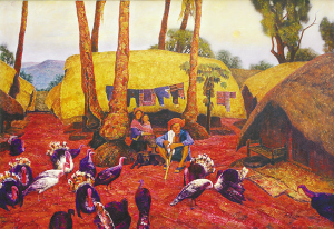 另一类是以风土人情为创作母题,这类作品大多取材于黎族苗族少数民族生活场景,其绚丽多彩的民族服饰,古风犹存的船型屋,独具特色的植被及特定的民族风情,容易给人以另类的感觉,“陌生”所带来的“新鲜感”具有一定的讨好性。这种强烈、具有较强平面装饰风格的手法,自然纯朴中颇有几分现代感,第一时间里的视觉冲击波常会令人赏心悦目。然而,这类作品不足之处是题材泛化及“精神贫血”,带有一定的“图解”性质,所依靠的仅是下乡采风或“断章取义”式的照片资料,较少从人类学、历史学、文化学、美学、生态学等角度去诠释这些风土人情内在的“精神性”。
