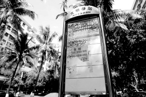 ← 9月4日,海口市文明路文明桥站公交站牌上,涂满了各种小广告。 本报记者 张杰 摄