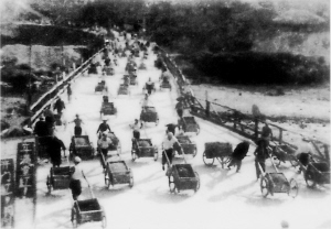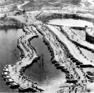 | 1958年,松涛大坝围堰工程施工现场,无数小船连成了四条浮桥,以方便跨江运土。 |