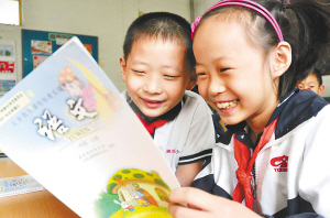| 开学伊始,山东滨州市滨城区第四小学一年级学生张博雅(右)和尹宇航(左)在教室里阅读新领到的免费教科书。 新华社发(李荣新 摄) |