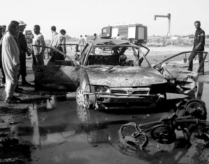 9月7日,在伊拉克安巴尔省省会拉马迪的爆炸现场,当地居民查看被炸毁的汽车。伊拉克内政部7日说,拉马迪市区外一高速公路检查站当天发生一起自杀式汽车炸弹袭击事件,目前已造成7人死亡、18人受伤,死者中有3名警察。 新华社/路透