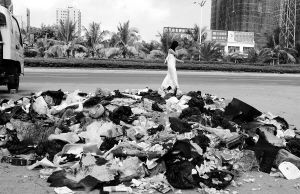 “海南日报吗?请你们马上派记者来看看吧,我们小区门前和出口的一段路,到处都是成堆的垃圾,一夜之间不知什么人倾倒了一大堆垃圾在这里,散发出来的酸臭味把我们都熏醒了。”9月7日上午9时左右,海口市丘海大道旁滨涯花园新村居民急匆匆拨打海南日报记者电话投诉说。