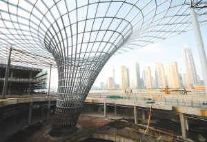 9月7日拍摄的上海新十六铺码头的主体建筑之一“浦江之云”玻璃天棚结构。近日,上海市城市景观新地标———新十六铺码头的主体工程完成,玻璃天棚、亲水平台和驳船码头等主体建筑现出雏形,工程进入机电安装和装饰施工阶段。 新华社发