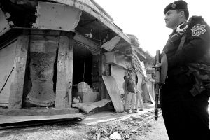 9月8日,在伊拉克迪亚拉省首府巴古拜市,一名警察在爆炸袭击中受损的商店附近警戒。伊拉克警方当天说,巴古拜市的一座什叶派清真寺7日夜遭自杀式爆炸袭击,共造成6人死亡,20人受伤。 新华社/路透