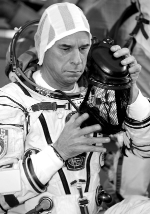 9月9日,加拿大太阳马戏团创始人盖·拉利伯特在俄罗斯星城宇航员训练基地参加训练。9月30日,盖·拉利伯特将乘坐俄罗斯“联盟TMA—16”载人飞船前往国际空间站,展开为期11天的太空之旅,届时他将成为全球第七位太空游客。 新华社/法新