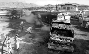 9月8日,在巴基斯坦西南部城市奎达市郊,消防员在油罐车起火现场灭火。当天,为驻阿富汗北约部队运送燃料的油罐车在奎达市郊遭到武装人员纵火袭击,至少三辆油罐车被点燃。 新华社/法新