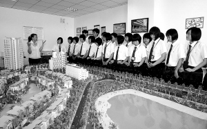 | 9月9日,在海口市第一职业中学,工作情景逼真的实训室里,老师正在指点同学们进行高端楼盘产品的销售。 本报记者 张杰 摄 |