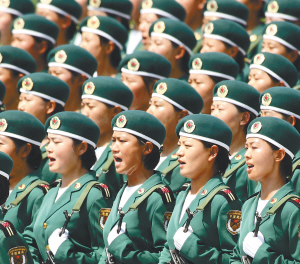 国庆60周年阅兵方阵中有三支“娘子军”:三军女兵方队、女民兵方队、女飞行员梯队。这是新中国历次阅兵中女兵方队最多的一次,其中三军女兵方队和女飞行员梯队是首次参加。图为阅兵式训练中的女民兵方队。 新华社记者 王建民 摄