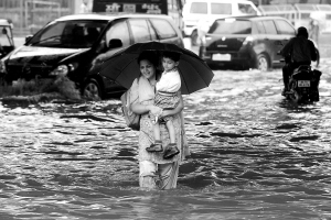 9月10日,在印度首都新德里,一名妇女抱着女儿走过被洪水淹没的街道。新德里当日早晨遭受大雨袭击,致使城市交通瘫痪。 新华社/法新