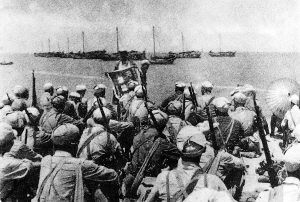 | 1950年4月, 40军355团2连在渡海战役出发前,进行誓师动员。 本报记者 李英挺 翻拍 |