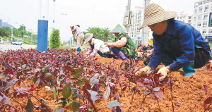 | 昨天上午,为迎接国庆的到来,五指山市有关部门工作人员正在市迎宾大道两旁加紧种植花草。 特约记者尹秋艳 通讯员赵茂冰 摄