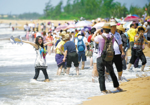 随着国际旅游岛建设的深入展开,博鳌景区吸引了越来越多的国内外游客。图为游客们正在玉带滩游玩。 本报记者 王凯 摄