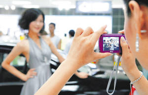 | 9月12日,来参观车展的市民把美女香车摄入镜头。 本报记者 苏建强 摄