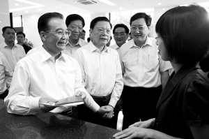 | 9月11日,温家宝在大连市高校毕业生就业服务中心的一楼服务大厅里与前来求职的大学毕业生亲切交谈。 新华社记者 姚大伟 摄 |