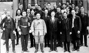 | 1912年2月16日袁世凯(前中)让助手剪去了自己的辫子。3月10日宣誓就任中华民国临时大总统。(资料图片) |