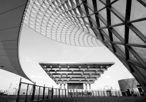 上海世博轴主体结构完工 主体结构完工的上海世博轴阳光谷与远处的中国馆遥相呼应(2009年9月13日拍摄)。 2010年上海世博会永久性标志建筑之一———上海世博轴的主体结构当天完工。世博轴位于上海世博园区的主要入口处,是园区内规模最大的单体建筑。世博轴分为地上、地下两层,上层设计了一个巨型的膜结构,看起来就像是荡漾的湖水。而世博轴上最引人注目的是晶莹剔透的、喇叭状的装置———“阳光谷”。 新华社发