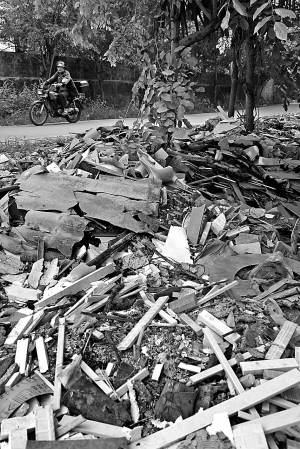 9月13日下午,记者来到本报7月14日曾曝光过的海口市龙华区城西镇学院路两院北侧墙外,一条铺设水泥路面的小巷,路边依然是建筑垃圾堆成小山,不少树木、草丛中都是碎瓷砖、建筑垃圾等。 本报记者 古月 摄