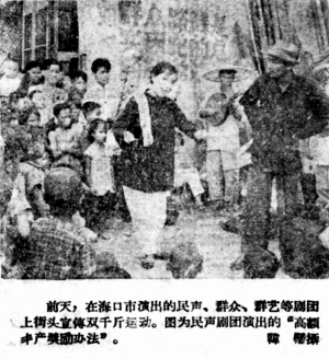 | 1958年8月13日,在海口市演出的民声剧团上街演出《高额丰产奖励办法》,宣传双千斤运动。 韩璧 摄 |