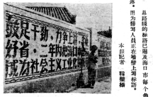 | 一九五八年六月,海南开展声势浩大的社会主义建设总路线的宣传运动。“总路线”的标语已经遍及海口市每个角落。图为缮写人员正在墙壁上写标语。 韩璧 摄