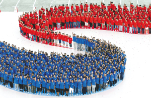 9月15日,千名上海大学生在上海交大菁菁堂广场组成上海世博会志愿者标志———汉字“心”形图案,庆祝“向祖国致敬,为世博添彩”上海市青少年迎世博百万笑脸征集活动校园行正式启动。 新华社发