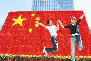 9月15日,在北京市朝阳区双井桥附近,一面由两万多支玫瑰组成的“五星红旗”鲜艳醒目,吸引路人拍照留念。 新华社发