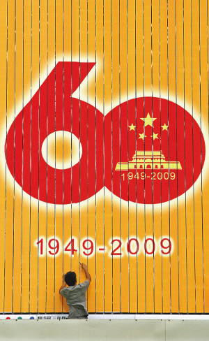 | 9月16日,海口市国兴大道西路高空户外广告架上,施工人员在张贴高约8米的大型国庆标志。这是海口市委宣传部为迎接新中国60华诞推出的主题宣传广告。 本报记者 李英挺 摄 |