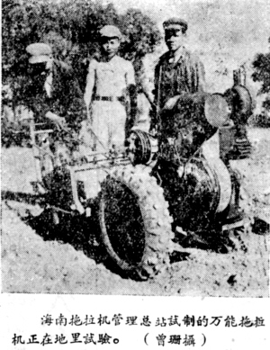 1958年4月,在工业大跃进中,海南拖拉机总站历经千辛万苦试制出两部万能拖拉机,引起轰动