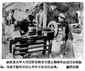 ↑ “大跃进”时期,金江县太平人民公社大造土制车床进行自我装备。图为安装好的土车床在试车。 扬清朗 摄