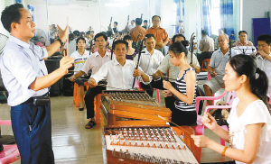 9月17日,琼海市大路镇文化中心乐声悠扬,时而是海南传统民间音乐,时而是红色经典乐曲。这是琼海市大路镇农民乐队在忙于排练节目,准备参加全市庆国庆民乐大赛。大路镇农民乐队由30多名老中青年农民乐器爱好者组成,始建于2001年。为了参加庆祝新中国成立60周年琼海市民乐演奏与琼剧唱腔大奖赛,该乐队从8月起就开始排练曲目。 本报记者 陈德雄 摄