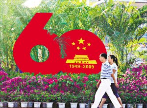 三亚市园林环卫部门提早着手,在街头摆放鲜花及装饰牌,迎接新中国成立60周年。 特约记者 孙清 摄