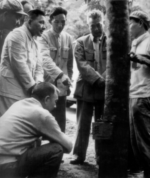| 1960年,邓小平同志(左二)和李先念同志(右二)在海南兴隆华侨农场观看割胶。 |