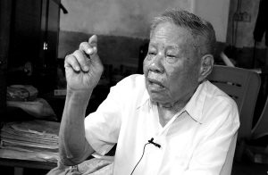 | 92岁高龄的符运丰回忆接应渡海大军情形。 南海网记者 汪德芬 摄 |