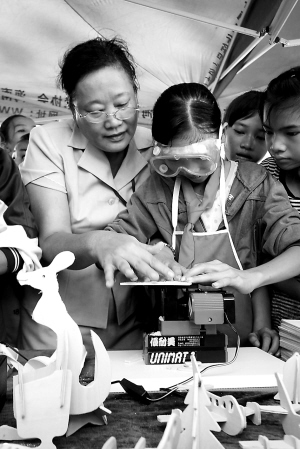 9月18日,海南省“全国科普日”活动在昌江黎族自治县石碌镇片石村三月三广场启动,吸引当地众多学生和农民群众等前来参观。图为工作人员正在指导学生利用科技新产品制作自己喜欢的模具。 特约记者 曾高文 摄