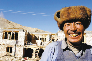 | 2007年12月19日,西藏尼木县尼木乡聂玉村村民索朗多吉在自家即将完工的新房前露出笑容。 |