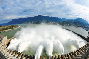| 2008年11月7日,江水通过三峡泄洪大坝下泄。 (本版照片:新华社发) |