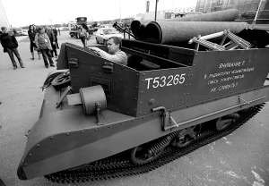 这是9月20日在俄罗斯首都莫斯科克洛库斯展览中心拍摄的一款老型履带运输车。9月17日至20日,第14届俄罗斯伊利亚·索罗金“老爷车”展在这里举行。 新华社记者 鲁金博 摄