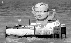 9月21日,在澳大利亚墨尔本一处海滩,一名牛津饥馑救济委员会澳大利亚分支机构的成员装扮成澳总理陆克文的卡通形象,在海水中“起床”。这个非政府组织希望以此督促包括陆克文在内的世界各国领导人在年底举行的哥本哈根联合国气候变化大会上能有积极成果。 新华社/法新