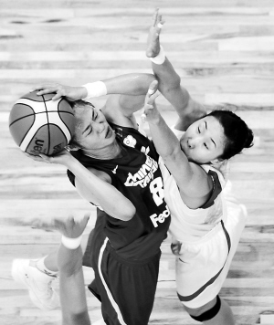 女篮亚锦赛 中国队胜 中华台北队 9月21日,在印度钦奈进行的亚洲女篮锦标赛B组第四轮比赛中,中国队以82:51战胜中华台北队,中国队取得四连胜。图为苗立杰(右)在比赛中防守。 新华社发