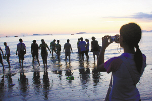 海上落日是三亚一景,图为游客在观赏彩霞满天的美景。 特约记者 孙清 摄