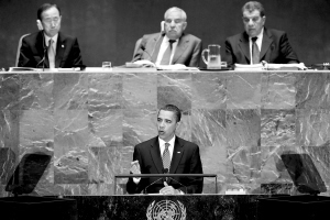 | 9月23日,在美国纽约联合国总部,美国总统奥巴马在联合国大会一般性辩论中发言,称美国不认为以色列继续在约旦河西岸和东耶路撒冷修建犹太人定居点是正当的。