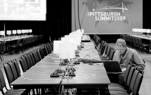 | 9月22日,在美国匹兹堡市,一名媒体工作人员在二十国集团金融峰会媒体工作间内工作。二十国集团领导人第三次金融峰会将于24日在匹兹堡拉开帷幕。新华社记者 张岩 摄 |