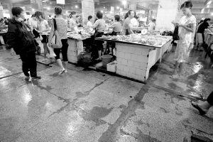 ↑→ 9月23日上午,海口普降暴雨。风雨过后,记者在南宝路菜市场和市场外的街道看见,这里的环境卫生依旧整洁喜人。 本报记者 张杰 摄