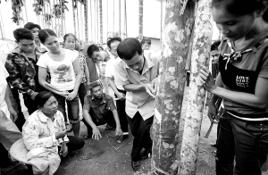 | 9月16日,110名细水乡农民,集中在白沙黎族自治县农业科技培训基地,学习割胶技术。 本报记者 苏晓杰 摄 |