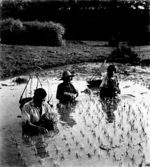 | 1969年,石屋大队社员在齐胸的沼泽地里插秧。 蔡自强 摄 |