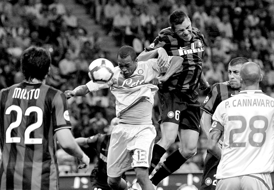 24日,在意甲第五轮比赛中,国际米兰队以3比1胜那不勒斯队。图为国米队球员卢西奥(上)头球攻门得分。 新华社发