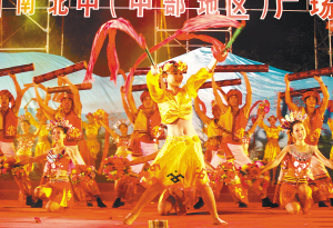 为庆祝新中国成立60周年,日前,第二届海南乡土文化节暨东南西北中(中部地区)广场文艺会演在白沙县举行。图为该县民族歌舞团、县民族中学表演舞蹈《祝福》。 本报记者李关平 文 苏晓杰 摄