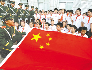 9月24日,福建省公安边防总队海警一支队国旗班战士来到驻地的福州市马尾区亭江中心小学开展“我爱五星红旗,祝福祖国”主题升旗仪式,迎接中华人民共和国成立60周年。 新华社记者 张国俊 摄